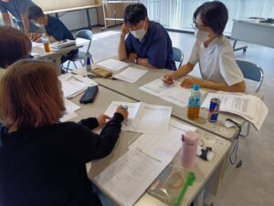 最終回のテーマは「介護過程の展開と実際②」。冒頭では研修目標の確認とこれまでの学びの振り返りを行い、その後「自宅で生活するCさん」の事例を用いて学習を深めました。午前中は講師が持参した資料をもとに、介護認定の流れや認知症についての理解を整理しながら、事例の情報を個人で分析・アセスメントしました。受講者一人ひとりがCさんの生活背景や心身の状態に向き合い、課題をどのように捉えるかを考える時間となりました。