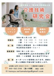 介護技術研究会は、令和8年3月25日(水)に、介護老人保健施設あいの郷会場にて開催され、午前・午後の二部制となっています。参加費は無料で、気軽にご参加いただける研修です。