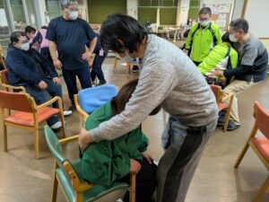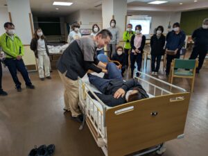 実際に自分で動いてみて自然な体の動きを邪魔しない援助技術、ご利用者のできる能力を奪わない介護について体験しました。