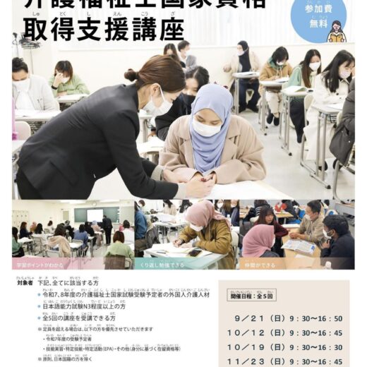 令和7年度 外国人介護人材のための介護福祉士国家資格取得支援講座 受講者募集... お知らせ / 外国人介護人材のための介護福祉士国家資格取得支援講座 2025年8月14日 日本介護福祉士会主催、埼玉県介護福祉士会実施のもと、「外国人介護人材...